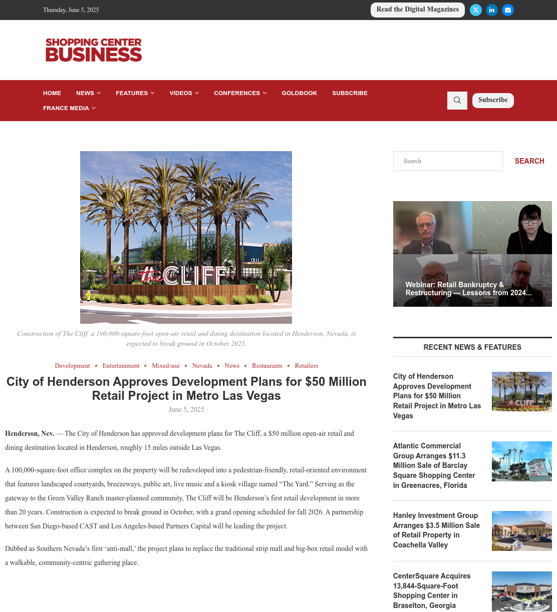Henderson, Nev. — The City of Henderson has approved development plans for The Cliff, a $50 million open-air retail and dining destination located in Henderson, roughly 15 miles outside Las Vegas.
